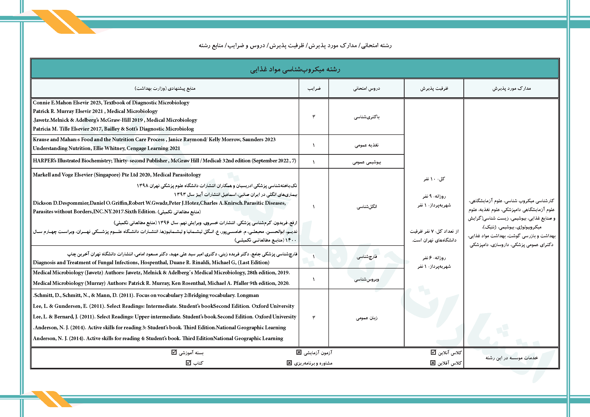 منابع، دروس و ظرفیت پذیرش رشته میکروب مواد غذایی بر اساس کنکور سال ۱۴۰۴ میباشد.
