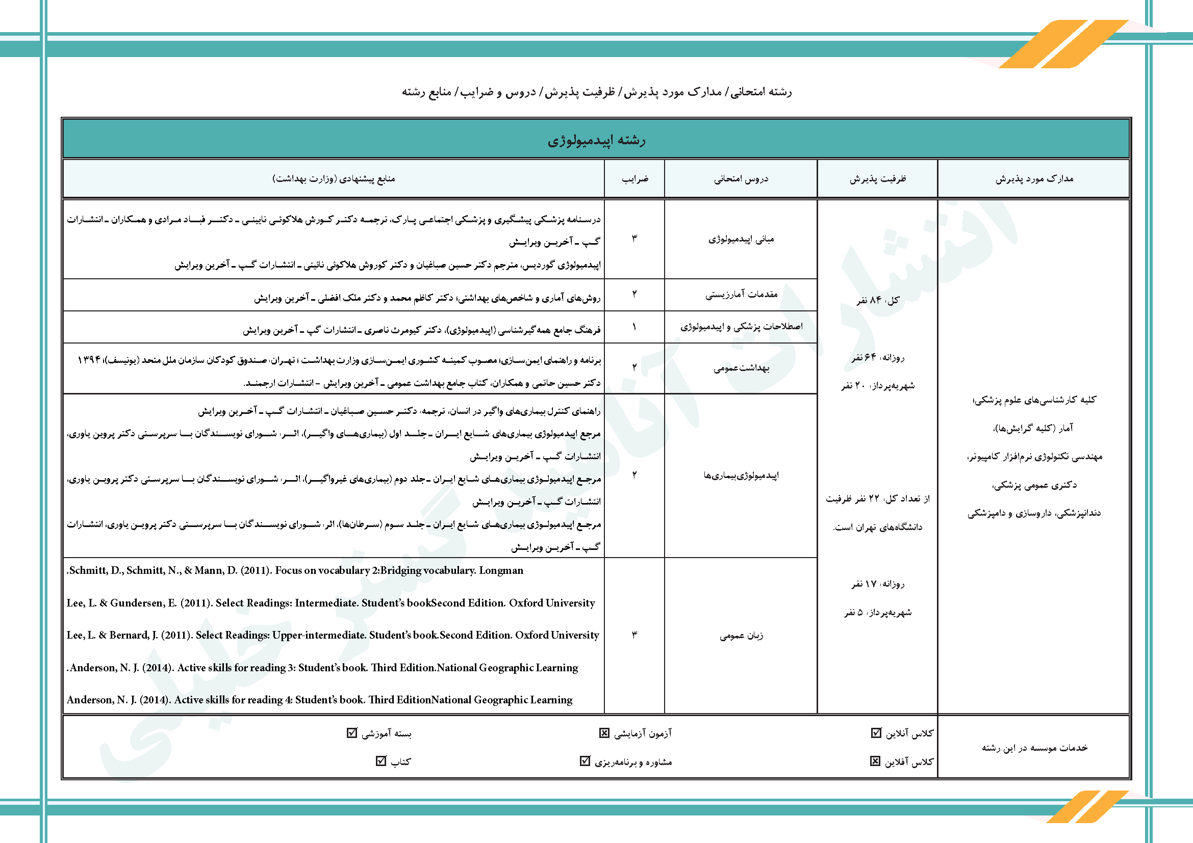 منابع، دروس و ظرفیت پذیرش رشته اپیدمیولوژی بر اساس کنکور سال ۱۴۰۴ میباشد. اپیدمیولوژی به عنوان علمی که به بررسی انتشار و شیوع بیماریها در جوامع مختلف میپردازد، در جامعه از اهمیت بالایی برخوردار است. این تخصص به واسطه تحلیل دقیق دادههای بیماریها و بهبودیافتگان، میتواند به پیشگیری و کنترل انتقال این بیماریها کمک کند.